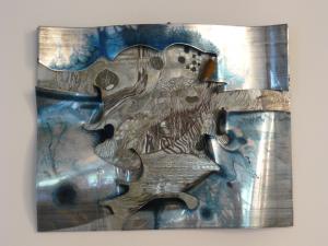 Plaques (zinc) découpées, déformées, gravées et encrées en sépia et bleu. |