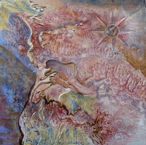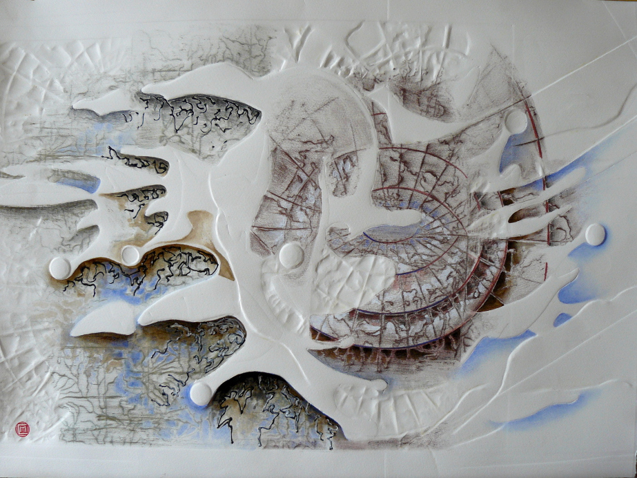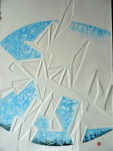 Gaufrage. Crayons de couleur, acrylique, pastels gras et sables. |