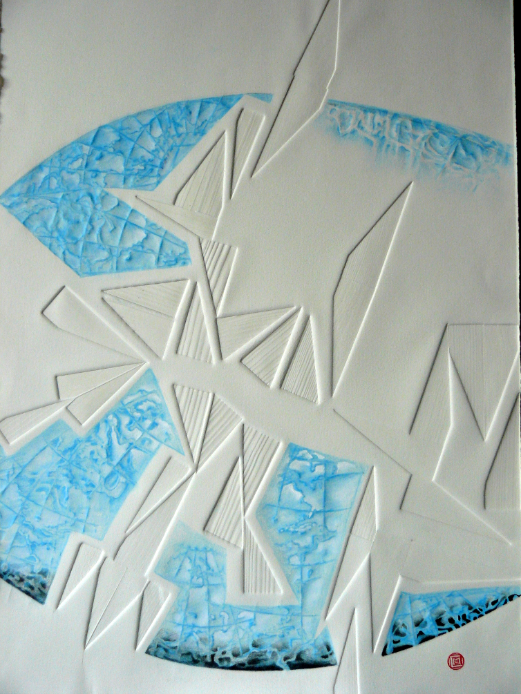 Gaufrage. Crayons de couleur, acrylique, empreintes en relief. |